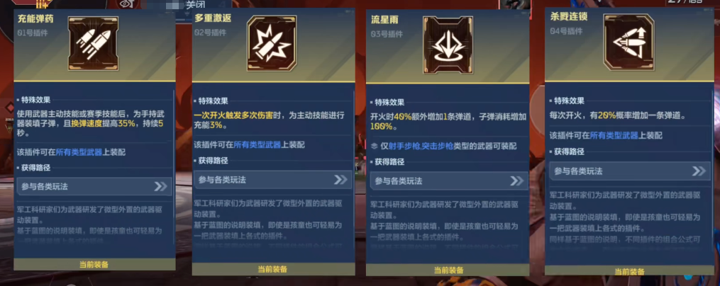 部分插件虽表面效果突出,但实际适配度较低,需谨慎取舍。例如“弱点续弹”,依赖精准命中弱点才能生效,实战容错率低,仅适合操作精度极高的玩家,普通用户不建议选用。“超载弹夹”与“流星雨”存在机制冲突:后者耗弹速率极高,即便扩容也难以支撑完整战斗周期,易出现弹尽被迫换弹甚至空仓哑火,综合收益远低于“充能弹药”。“渐稳连击”虽可小幅提升射击稳定性,但对整体输出循环无实质增益,故亦不在推荐之列。
