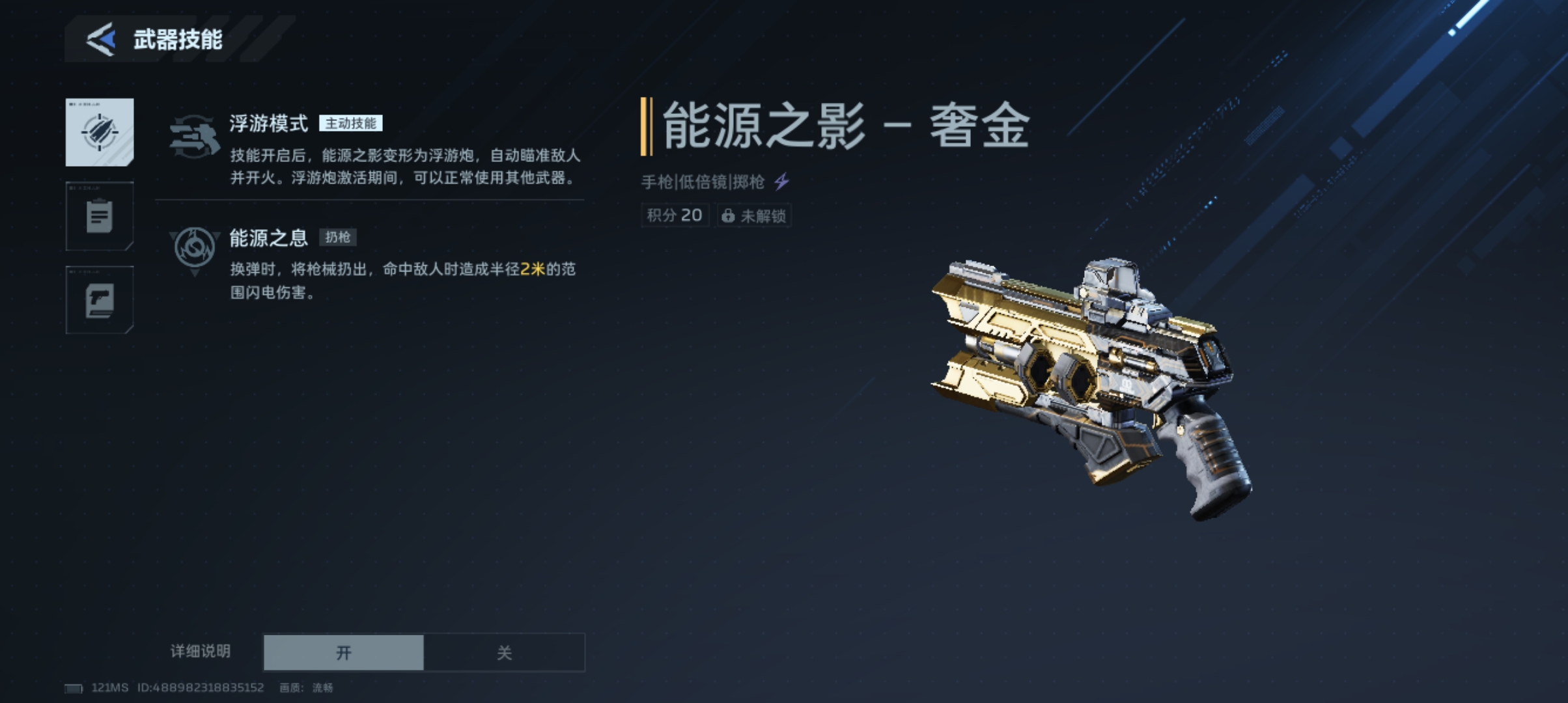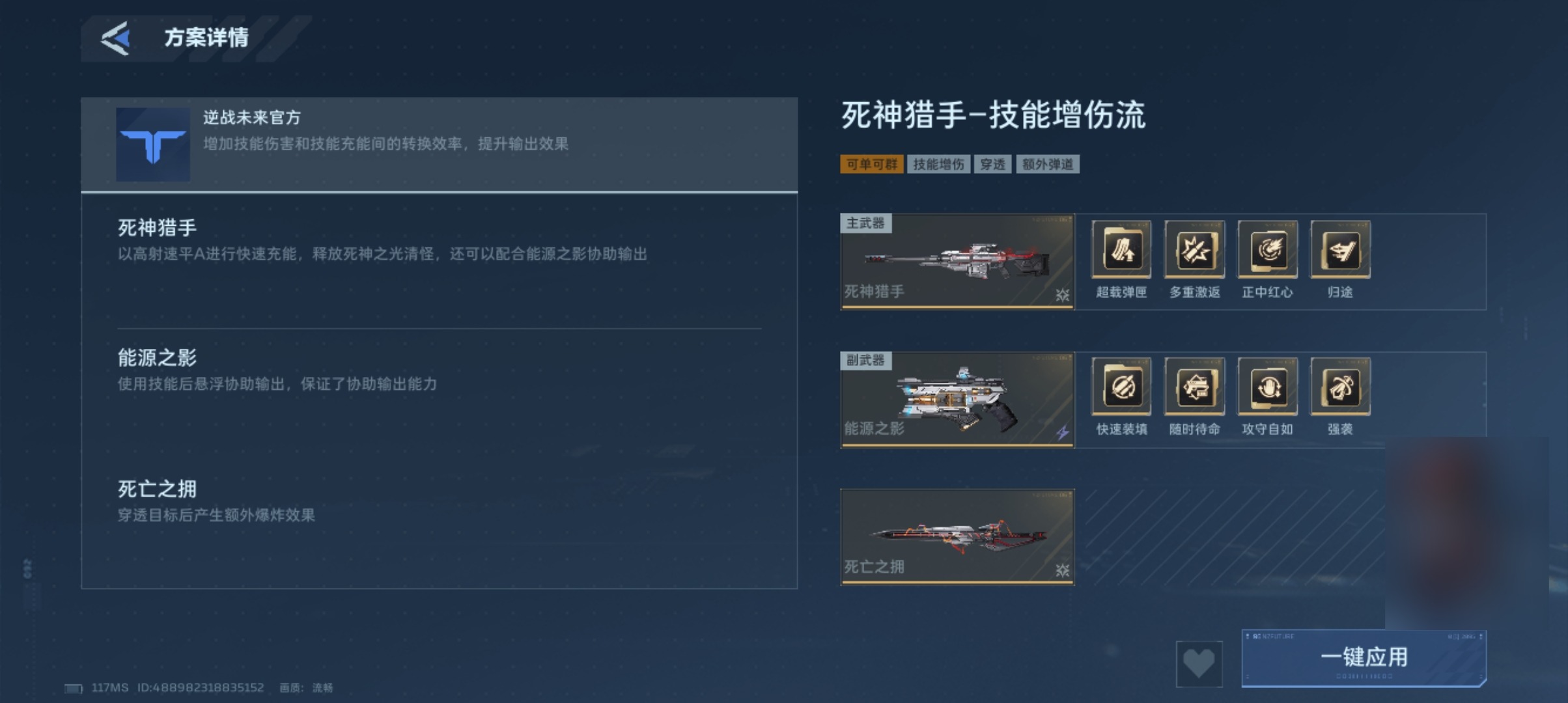 该武器具备两项标志性技能:主动技能可部署浮游炮自动索敌射击;被动技能则在换弹动作完成瞬间触发,投掷本体枪械造成范围闪电元素伤害。由此可知,其设计逻辑围绕“充能效率”与“元素伤害转化率”展开。在武器搭配层面,推荐主武器选用死神猎手——这把金色品质武器具备高射速与高单发伤害特性;近战位建议配置死亡之捕,同为金色品质,可形成攻防节奏互补,构成当前版本公认的高效组合体系。