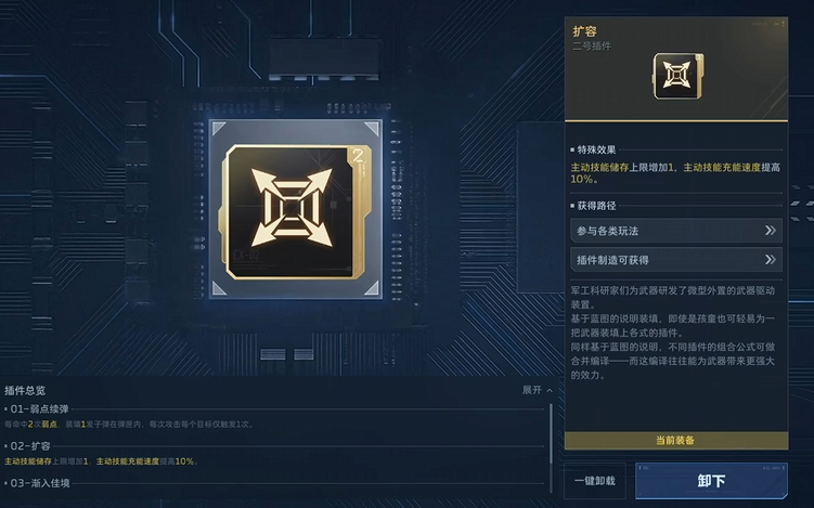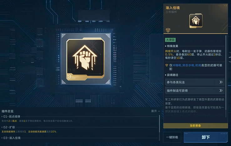 以上三款插件均为当前版本中通用性突出、成长路径清晰、资源投入回报率较高的金色品质选择。相较于绑定特定武器的专项插件,它们在多数主流枪械上均能发挥稳定增益效果。建议新手及中期玩家优先完成这三类插件的养成,再根据主力武器特性拓展专属强化方案。