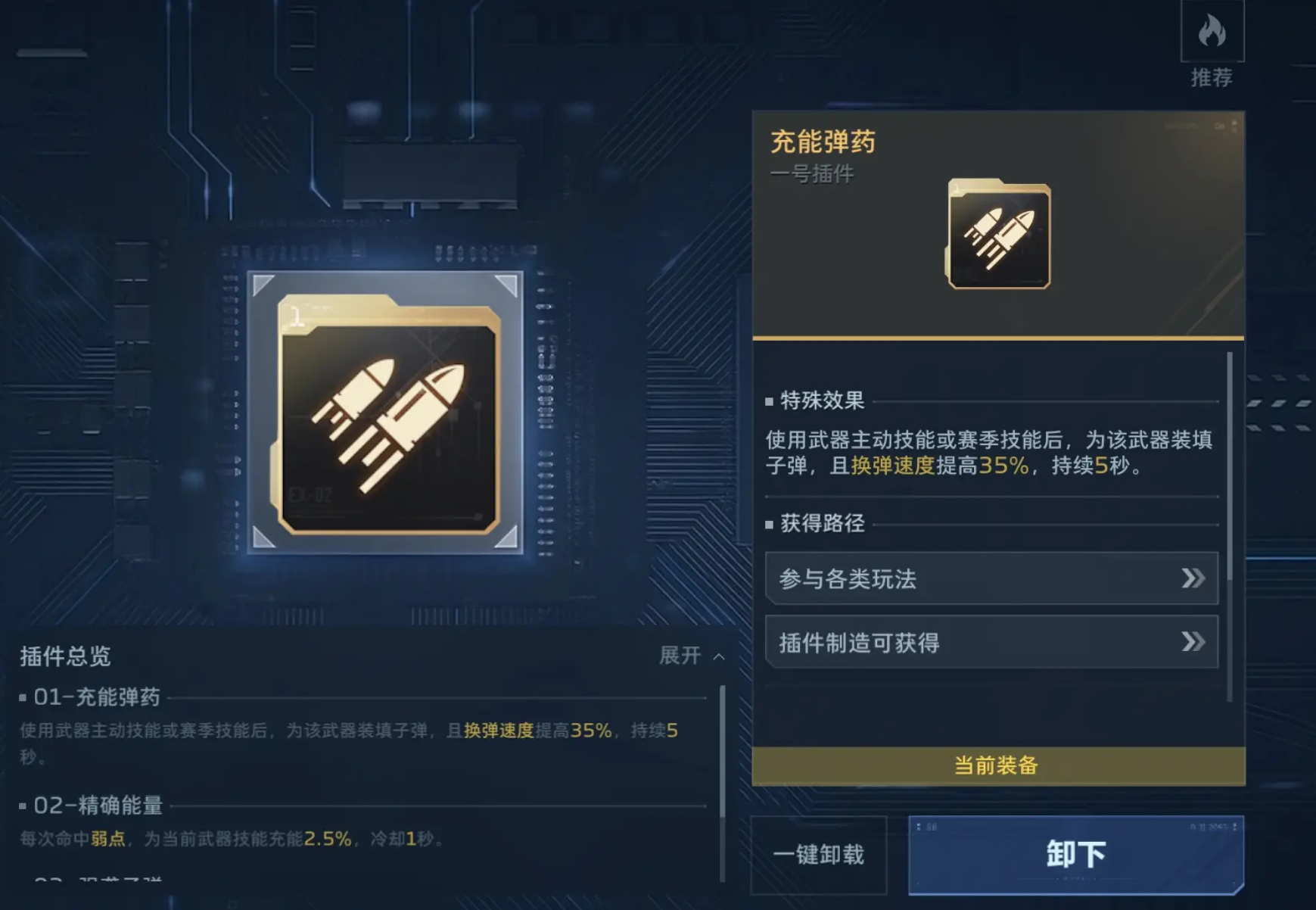 首推插件为【充能弹药】——该金色插件具备全武器系高兼容性,核心作用是大幅压缩换弹动作耗时,有效缩短火力输出间隙。在快节奏交火或连续推进关卡中,这一特性可显著降低因换弹导致的生存风险。获取途径包括主线剧情进度解锁、日常挑战任务奖励及周期性限时活动。