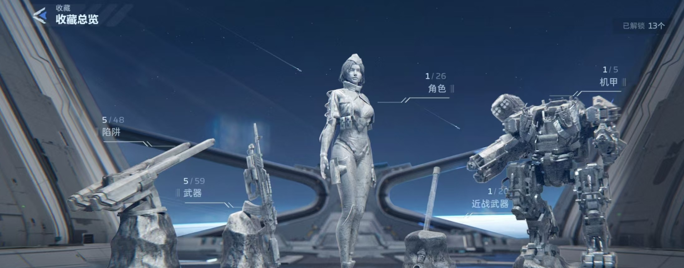 收藏系统位于游戏主界面大厅的左下角区域,点击“收藏”按钮即可进入。界面中实时显示当前收藏家等级、总积分、已收集物资数量等核心数据,涵盖角色、主武器、陷阱装置、近战武器、机甲等多个分类条目。
