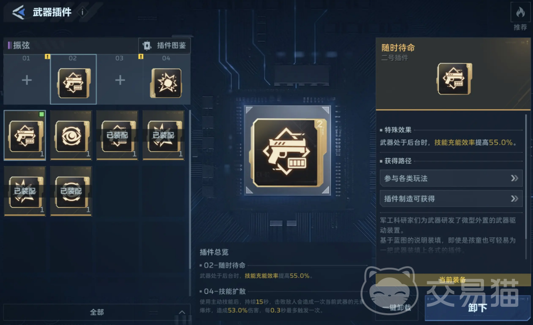 其二为合成获取。玩家可通过分解低阶插件积累“量子振芯”:每分解1个蓝色插件获得1个量子振芯,每分解1个紫色插件获得2个量子振芯。当累计达50个量子振芯后,可在合成界面选取5个同类型插件作为基础素材,系统将随机生成1个金色插件,且新插件的属性类型必定属于所选5个插件中已存在的某一类。