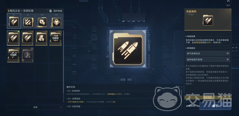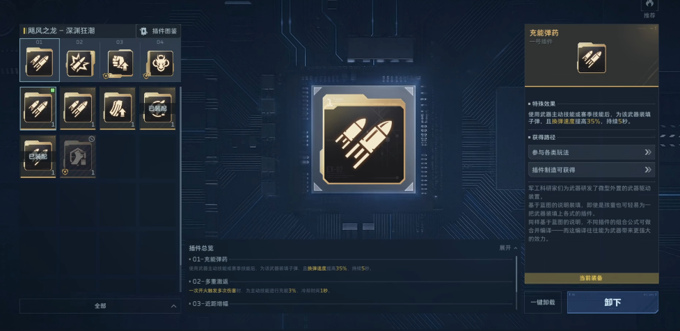 针对不同玩法模式,飓风之龙的插件搭配策略需灵活调整。以猎场模式为例,快速装填与危机装填组合能显著压缩换弹时间,保障持续火力压制;多重激返则有助于加快主动技能充能节奏,便于衔接高频爆发输出。