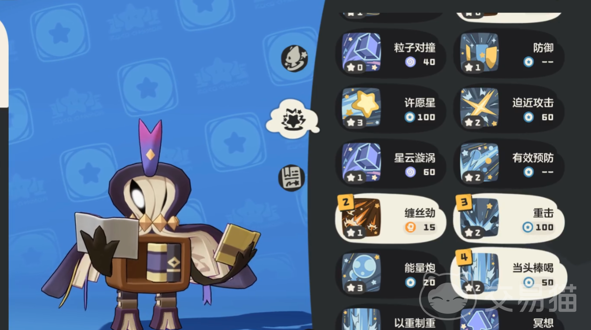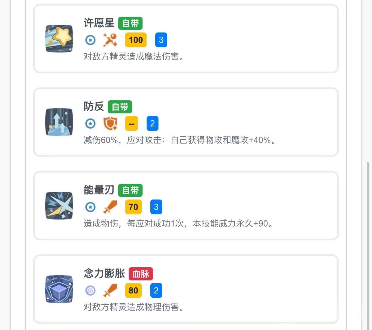 技能配置需依据敌方防御特性灵活调整。当目标魔法抗性较低时,推荐携带“许愿星”,该技能可造成稳定魔法伤害,六只全员配备亦可形成持续压制;若需强化生存能力与反制效果,“防反”是优选——成功触发后可减免60%所受伤害,并额外提升40%双攻,兼顾防御与爆发双重收益;面对物理抗性薄弱的对手,则建议选用“能量刃”,除造成物理伤害外,每次成功使用均可永久提升90点技能威力,越战越强,成长性突出。