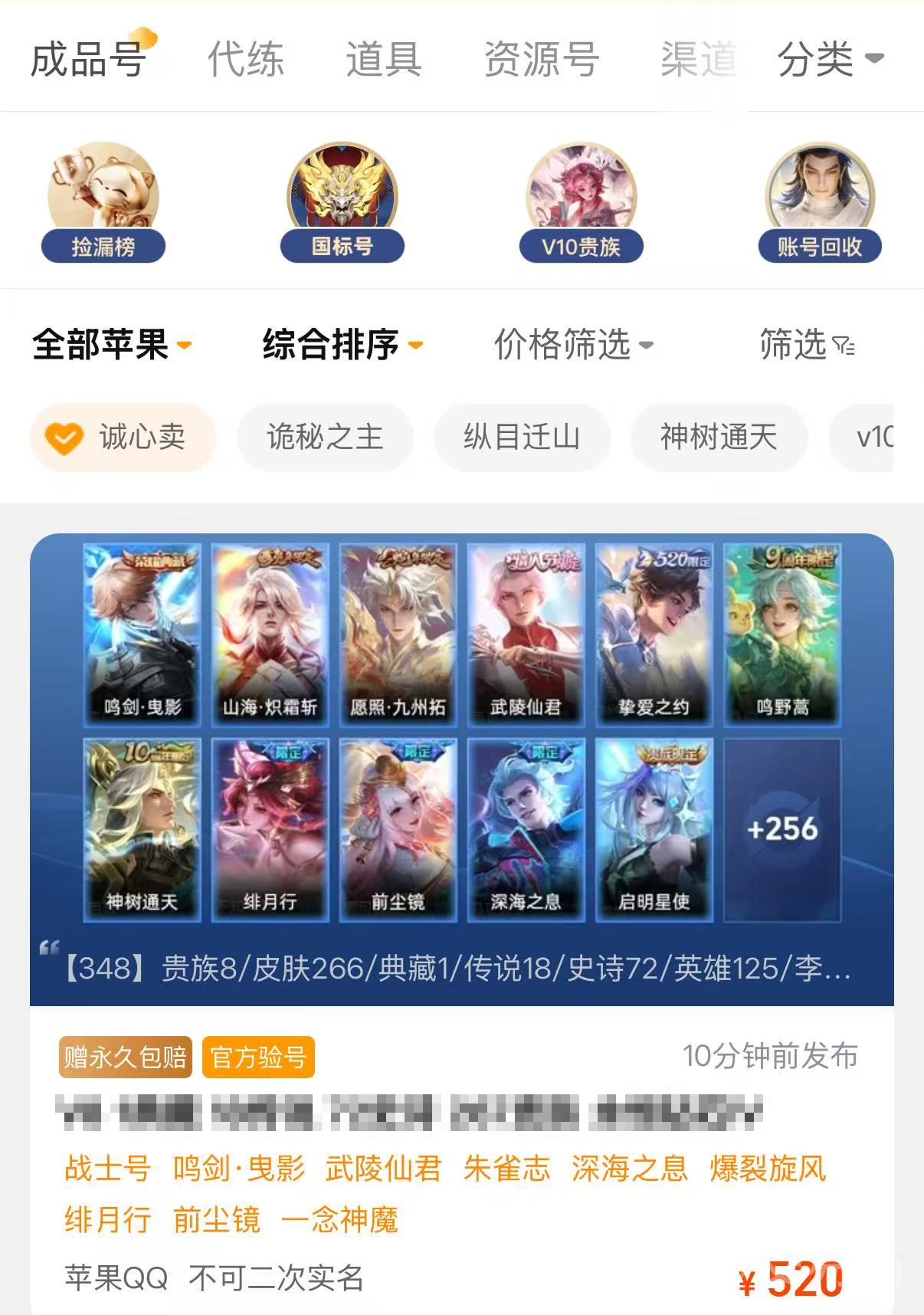 交易猫里的王者贵八号最低只要五百多元就能买到,如果对皮肤还有其他要求的话价格还会更高一些,算下来要比自己充值贵八划算得多。安卓手机可以通过上方连接下载APP,苹果手机也可以用交易猫官网来挑号选号。