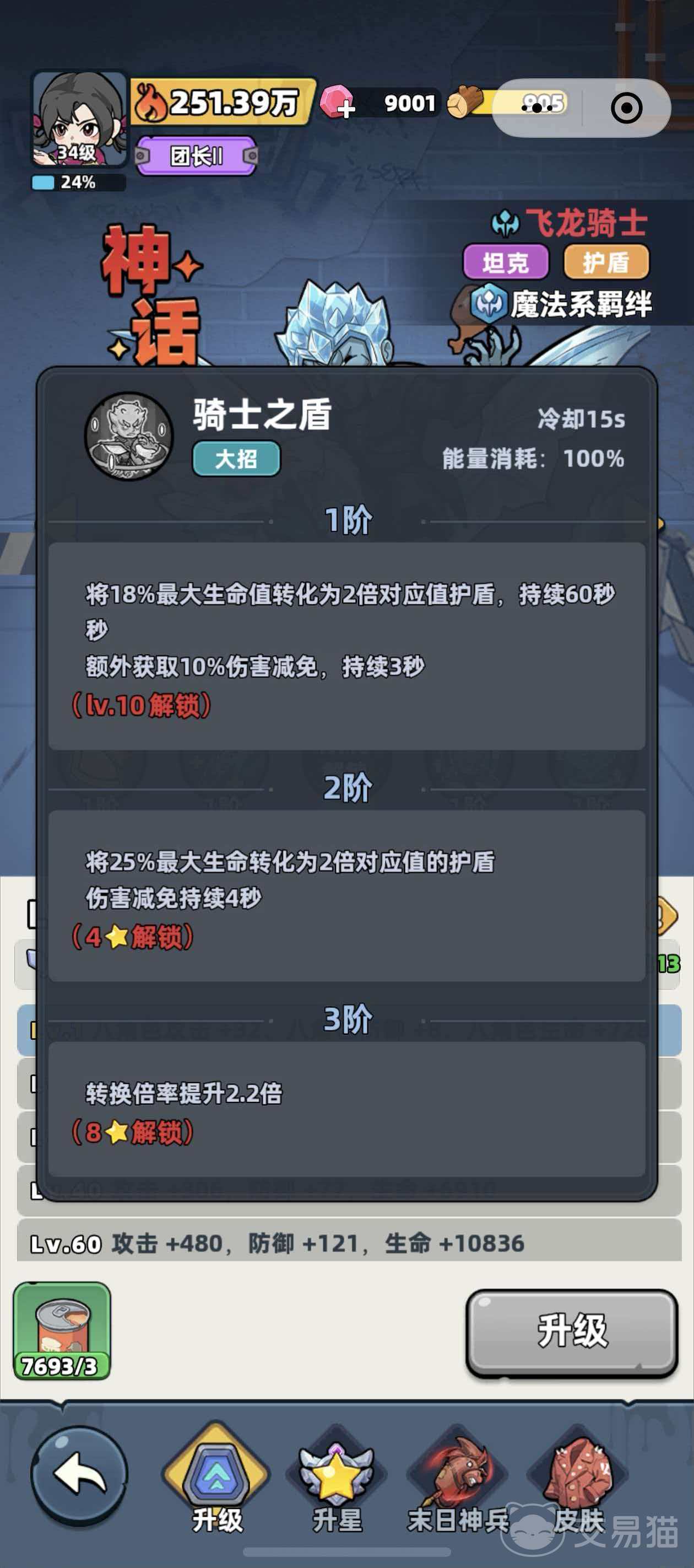骑士之盾作为终极技能,首次释放可将18%最大生命值转化为等额×2的护盾,持续60秒,并额外提供3秒内10%全伤害减免;升至二阶后,转化比例提升至25%,减伤持续时间延长至4秒,进一步放大其战略防护价值。