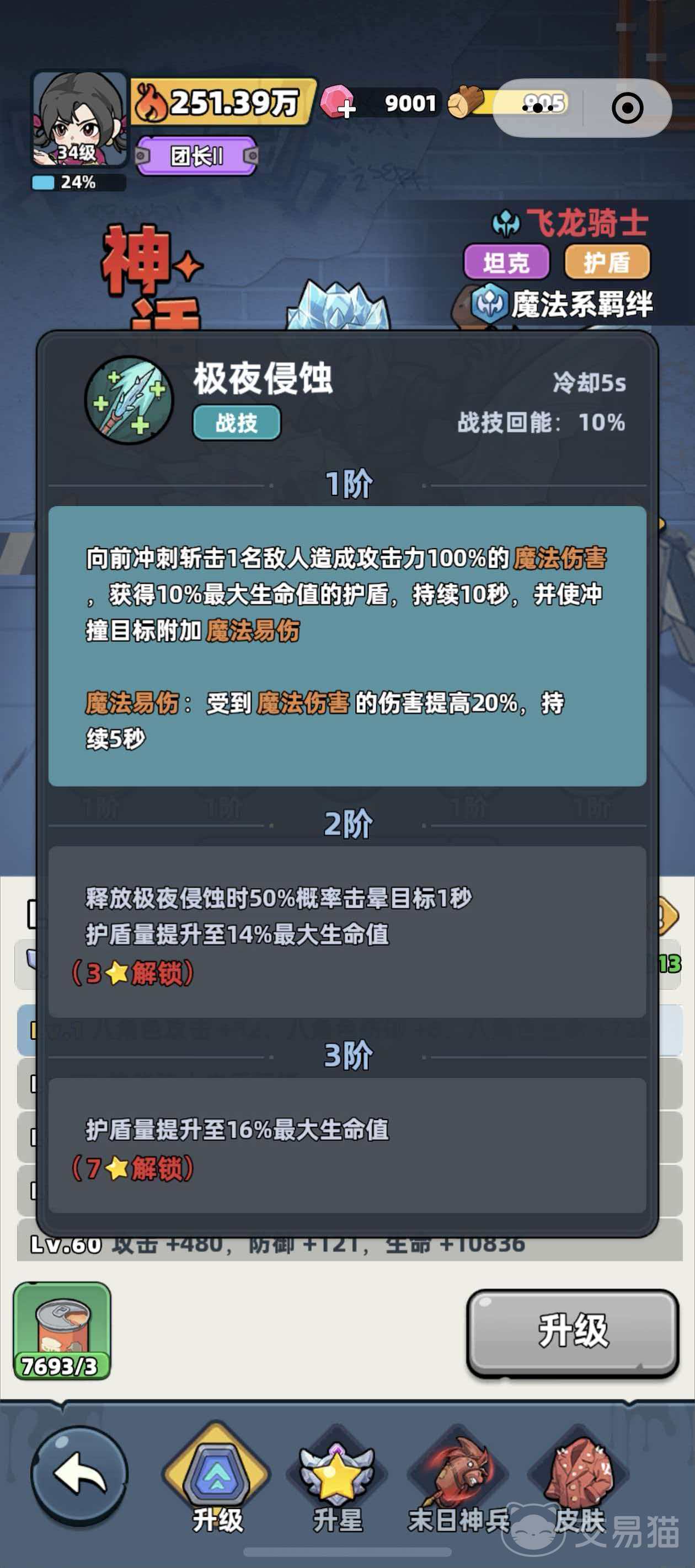 该英雄共配备4项技能:2个主动技与2个被动技。其中极夜侵蚀、凛冬庇护、护盾强化三项在获取角色时自动激活;而大招“骑士之盾”需将飞龙骑士等级提升至10级方可解锁。