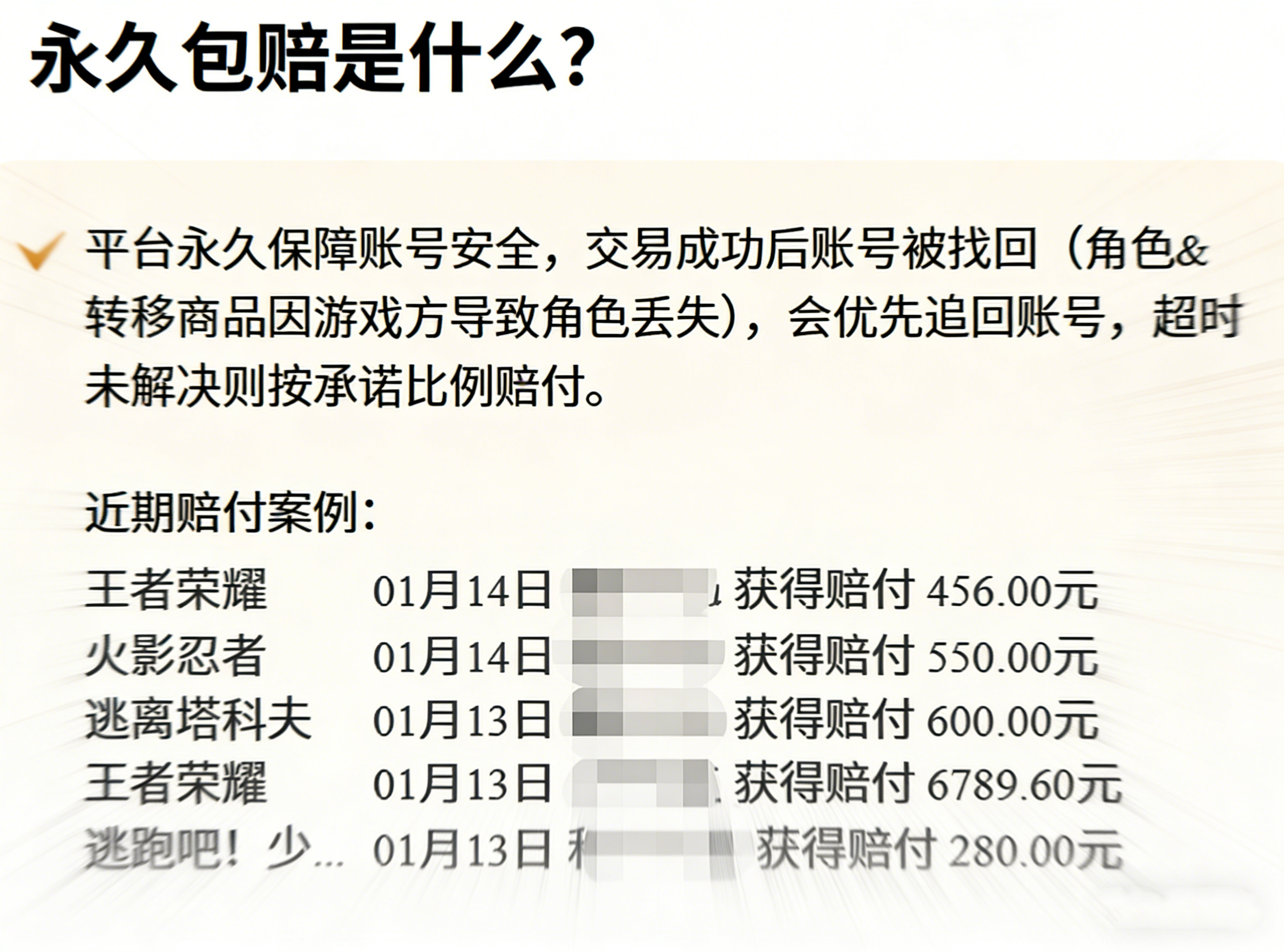 有的人担心自己的号买了后出现安全问题,或者直接被找回,这样就会亏损。其实不用怕,交易猫设有永久包赔服务。只要在交易期间出现了问题或者被找回的话,那就会赔付对应的金额给买家。这个服务卖家可以为买家提供,买家也能自己买一个,总之更加随心所欲!更何况交易猫中的用户都采用实名制,所以也可以查看对方的芝麻信用程度,大家认准信用高的人买号,也不怕出错啦!