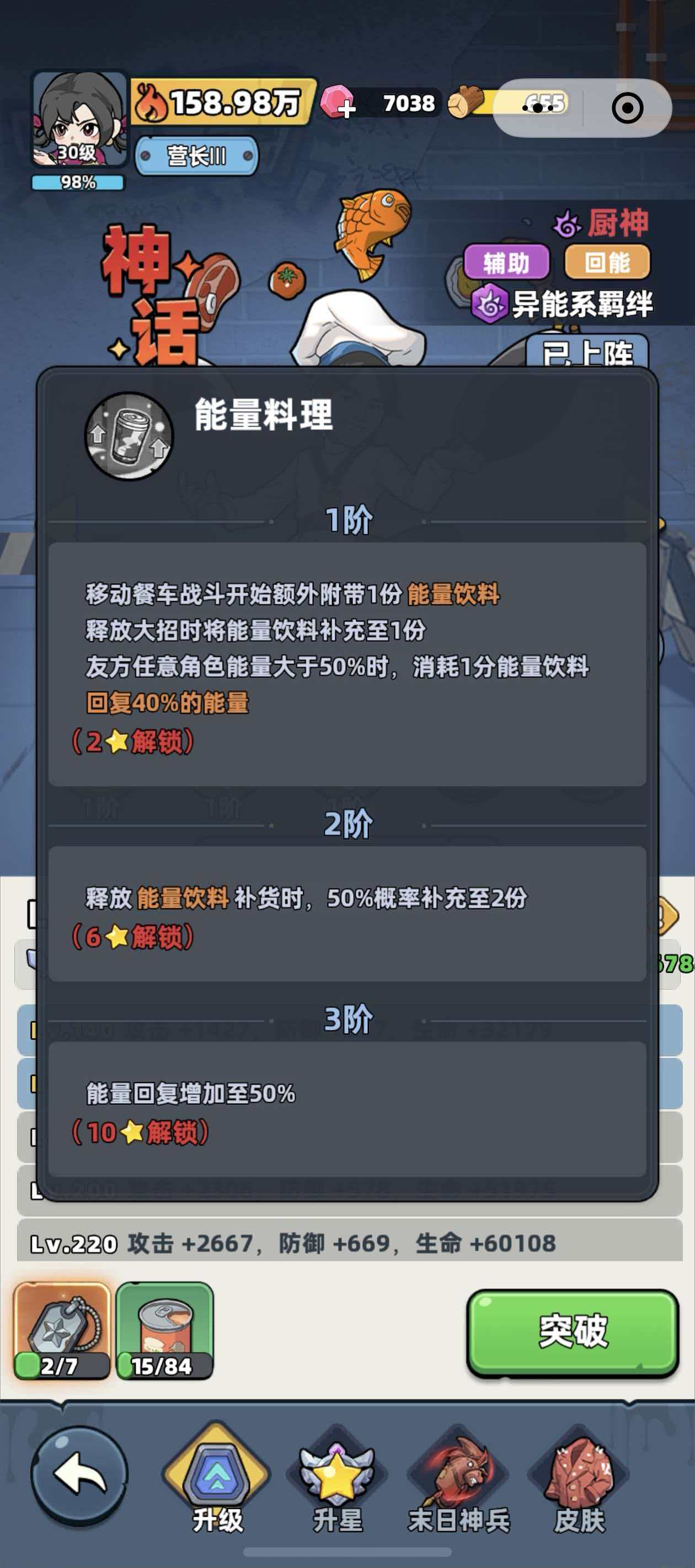 【能量料理】为厨神专属战术资源技能:进入战斗时自动携带1份能量料理;释放大招时,该料理立即为自身恢复60点能量;若任一队友当前能量高于50%,则消耗1份料理为其恢复40点能量。2阶效果使料理使用时有50%概率生成2份;3阶状态下,队友每次恢复的能量提升至50点。