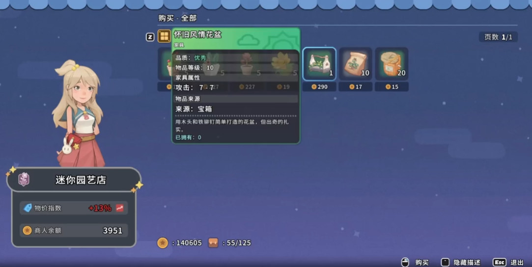 店铺每日营业时间为早上7点至晚间22点,店主NPC尼雅长期驻守店内。店内主要供应基础园艺物资,包括各类花卉种子、四方铲、浇水壶、施肥器及盆栽装饰等必备种植工具;同时提供土壤改良服务,例如生物结皮土,专用于改善沙地种植条件,提升植被成活率。