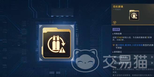 插件配置共设四槽,需按功能逻辑分层部署。第一槽推荐装配“危机装填”,该插件赋予近距离作战持续火力保障能力——当击杀目标距离≤10米时,自动补充3发弹药,显著缓解换弹压力。第二槽建议选用“多重击反”,每次射击均可为角色主动技能积累能量,加快技能循环节奏。第三槽优先配置“近距增福”,该效果随攻击距离缩短而线性提升伤害加成,贴身作战时收益尤为突出。第四槽固定使用“终极插件”,激活后全伤害翻倍,专为高强度对抗设计,在挑战高血量BOSS时可实现瞬时爆发压制。