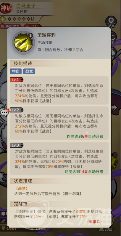 主动技能“荣耀穿刺”具备双重判定逻辑:当敌方无同列目标时,自动锁定生命百分比最低单位,发动4段独立攻击,合计造成224%物理伤害,全程无视护盾与伤害分摊机制;每段命中均有50%概率赋予【战意】。若敌方存在同列单位,则伤害提升至272%,【战意】获取概率升至60%;蛇灵星级达14星后,总伤害进一步提升至324%,并额外无视目标20%防御,【战意】获取率同步增至70%。完成觉醒强化后,该技能总伤害跃升至348%,无视防御比例提升至25%,【战意】获取上限达75%。值得注意的是,【战意】层数直接关联骑士剑阵的释放等级与附加效果。