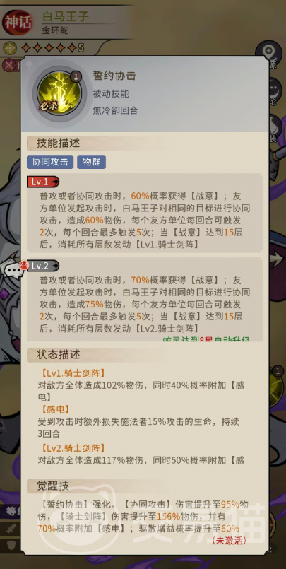 被动必杀技“誓约协击”构建了白马王子的协同作战体系。普通攻击或响应队友攻击时,均有机会触发协同打击——对同一目标追加60%物理伤害,并有60%概率获得【战意】。该效果在每回合内,可由每位友方单位触发2次,全队累计上限为5次。当【战意】累积至15层,将自动消耗全部层数释放1级骑士剑阵。随蛇灵星级提升,协同机制持续进化:8星时【战意】获取率升至70%,协同伤害提升至75%,释放剑阵升级为2级;16星时【战意】获取率达80%,协同伤害提升至90%,且15层【战意】可触发3级骑士剑阵,附带50%概率驱散目标1个增益状态。