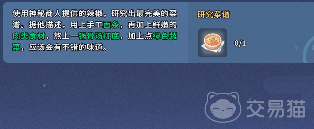 当玩家发展至中期(约完成主线第三章后),可在地图随机刷新的“神秘商人”处接取名为“如此美食”的限时支线。该任务要求使用商人提供的特殊香料组合,最终目标是成功复刻一道具有麻辣鲜香风味的传统面食——即“小面”。整体操作逻辑清晰,无复杂解谜或限时挑战,适合各阶段玩家尝试。