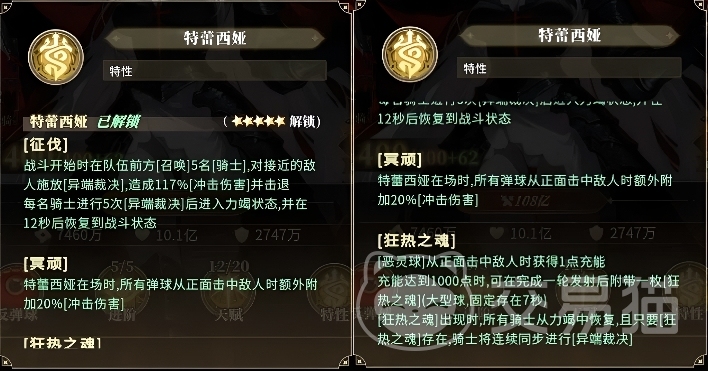 资源充足时,可将特蕾西娅培养至5星,此时骑士数量增加,且“异端裁决”基础伤害提升——每多1名骑士,伤害提高20%;晋升至6星或21星后,骑士体力耗尽时将自动每秒发射1枚恶灵球,12秒内总计额外生成60枚,大幅缩短“狂热之魂”的充能周期;升至11星时,冲击力增幅系数获得质变提升;搭配骑士数量叠加,可实现全局性战力跃升;16星形态则专精于高强度Boss战,保障长时间稳定输出压力。