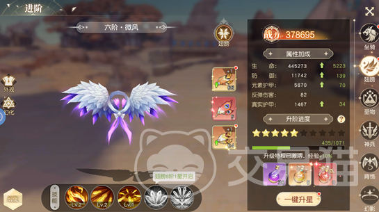 幻化系统则聚焦于视觉表达与差异化战力构建。该模块细分为“外观幻化”与“幻化属性”两个维度,二者属性侧重不同,需协同激活方可叠加生效。玩家可通过本体进阶解锁初始幻化形态,或使用限定道具直接激活高阶外观,如“星空晶羽”展现轻盈灵动,“猩红魔翼”凸显凌厉气场。风格迥异但品质统一,支持随时切换,保障长期体验的新鲜感。所有幻化外观均支持独立进阶与升星,消耗素材与本体进阶完全一致,资源复用率高。