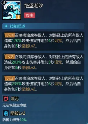 其核心技能“绝望潮汐”可召唤海浪沿直线路径推进,对途经所有敌人造成170%攻击力的范围伤害,并附加2秒减速效果;同时施加持续4秒的诅咒状态,使目标无法恢复生命值;技能释放后,爱丽儿自身获得持续5秒的坚毅效果,提升10%防御力。
