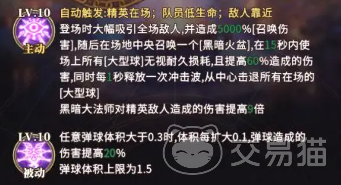 她的主动技能在登场瞬间触发全场聚怪效果,并对所有敌人造成5000%召唤伤。随后,在战场中央生成一座持续15秒的黑暗火盆——在此期间,所有大型球单位将完全豁免耐久损耗,实现持续稳定运转。