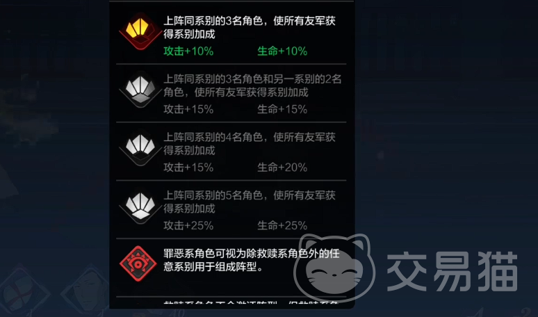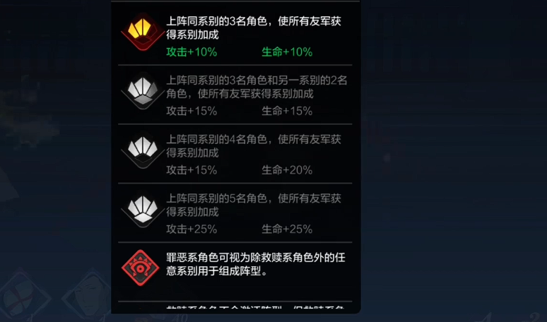 所谓“组织天赋”,实为基于角色属性组合触发的羁绊加成体系,是影响队伍整体强度的关键维度。其中,最基础且泛用性最强的是“同系阵容”羁绊:当队伍中配置5名相同系别(如火、水、风、光、暗、罪恶等)的角色时,即可激活完整效果——全队攻击力与生命值同步提升25%。该增幅幅度显著,是PVE推图与高难副本攻坚的重要支撑。