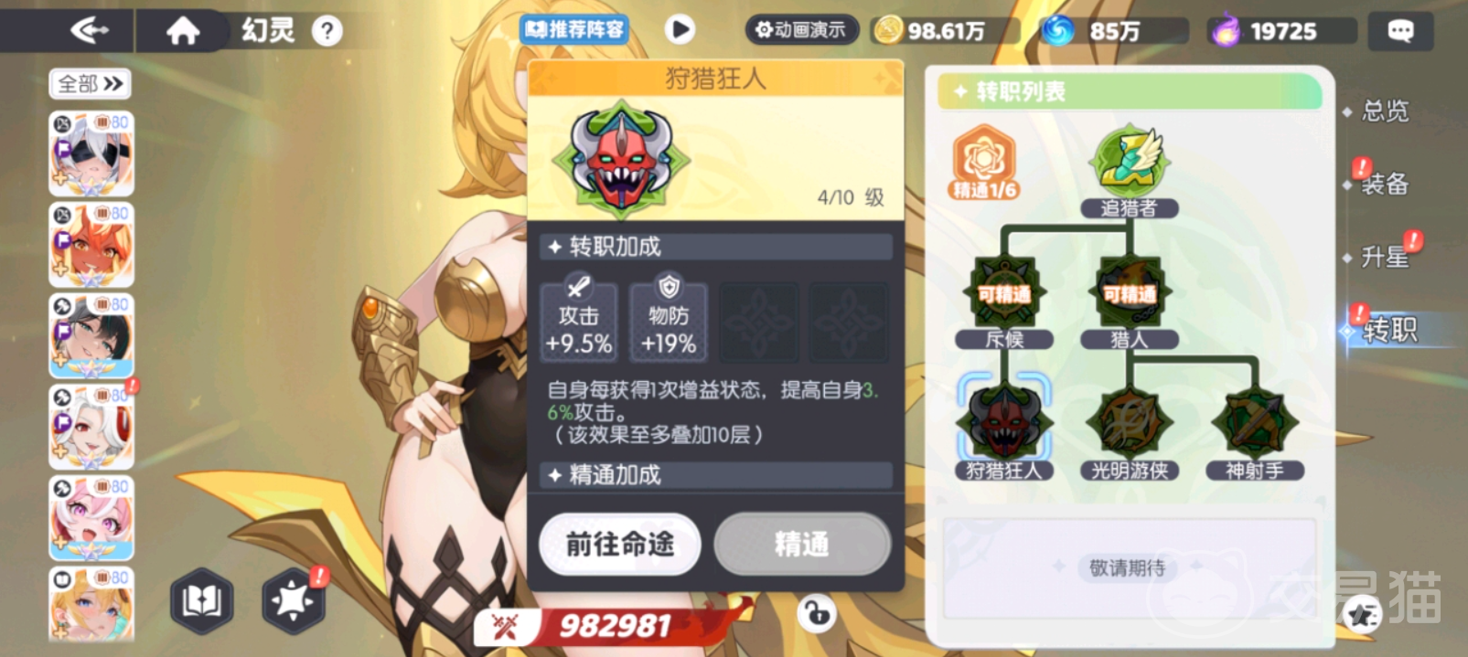 狩猎狂人归属斥候系分支,提供9.5%攻击力与19%物理防御加成。其特色机制为:每获得一层增益状态,即可提升自身3.6%攻击力,最多可叠加十层。虽然基础攻击力加成数值低于前两者,但泛用性强、适配度高,尤其适合搭配多增益流派阵容。对于攻击力缺口,可通过装备词条精准补足,整体容错率与团队兼容性表现优异。