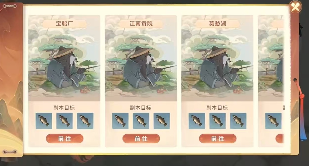 进入钓鱼系统前,需先定位可交互鱼塘。玩家可在主界面点击“玩法”入口,进入“闲暇”子页面,在该界面中可查看全部非战斗类活动,包括钓鱼、采集、科技研发等模块。系统会实时推送当前可前往的垂钓地点,如宝船厂、江南贡院、莫愁湖等。各区域对应不同生态池塘,所产鱼类种类、稀有度及基础重量均存在差异,具体信息可通过副本目标栏查阅。