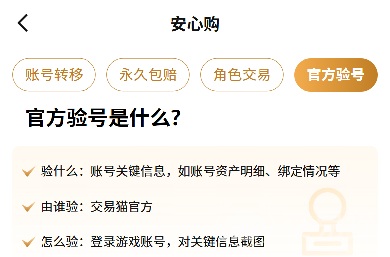 然后有的买家就担心商家所描述的账号信息有误,或者没有描述完全!这时就可以认准一些经过官方验证的账号,就会在详情页上提供一份极尽详细的验号清单,这时上面的所有内容都经过严格认证,并会一一地罗列出来,可以确保信息真实!这样也不用担心造假,可以看出该商品是否符合大家的购买需求!