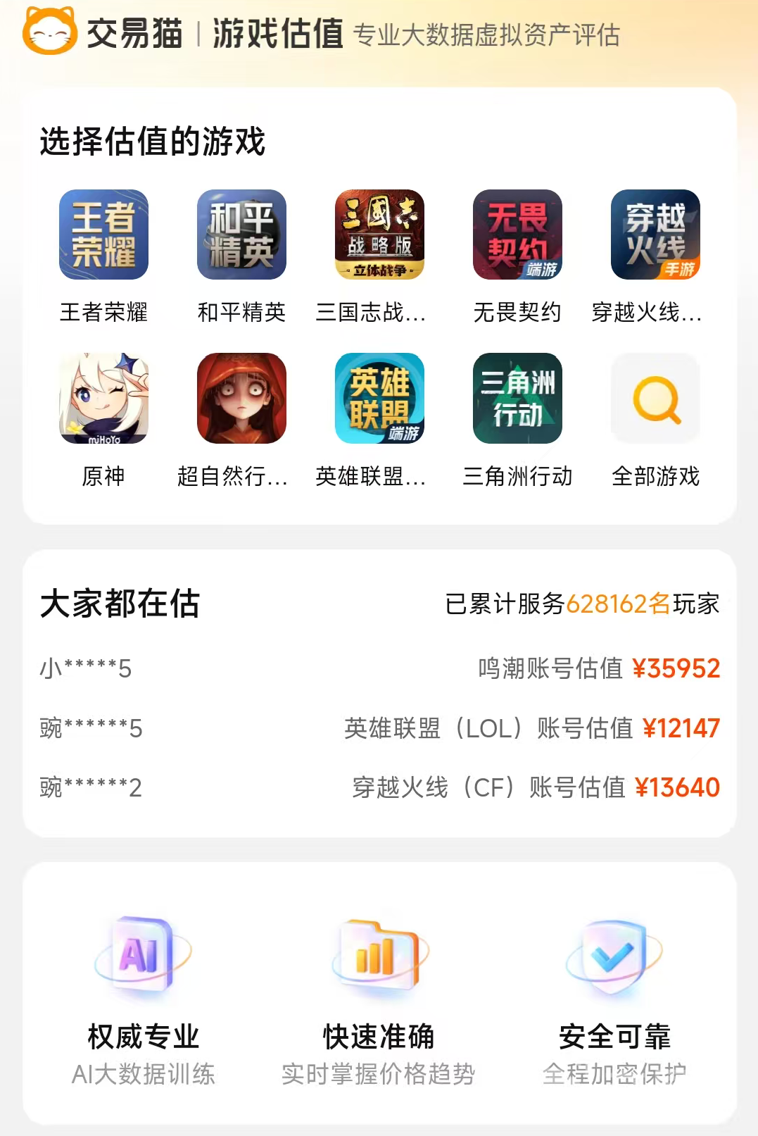 很多玩家在出售帐号以前肯定是对价格方面完全不了解的,导致出售账号的时候很麻烦,而交易猫是拥有一个估价功能的,只需要玩家们将对应的区服以及游戏的账号内容进行呈现,基本上可以得到一个合理的价格,之后玩家们就可以通过这个价格进行出售了,而且交易猫的交易过程全程有保障,可谓是集海量资源与硬核服务于一体,平台覆盖6000+款游戏,100万+件优质商品满足多元需求,累计服务超7000万玩家。以官方验号构建安全防线,百款热门游戏全程核验,确保账号信息真实、完整、准确无偏差;千人专业服务团队高效响应,0.5小时极速发货不拖沓,售后事宜48小时内妥善解决,打造省心交易闭环。要想使用的话安卓用户只需要通过上方通过按钮下载,ios用户可以到交易猫官网使用哦。