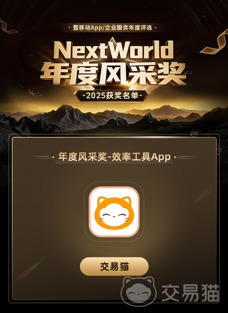 “NextWorld年度风采奖” 自2016年创立以来,历经十年沉淀,陪伴并见证了众多行业标杆与创新力量的成长轨迹,是行业内极具公信力的权威奖项,从产品影响力、数据表现、行业口碑等多重维度对产品进行综合评定,含金量颇高。而就在近日的【Next World】峰会中,交易猫荣获”2025NextWorld年度风采奖-效率工具APP“!