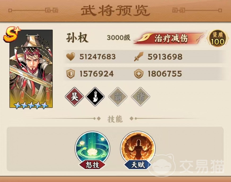 孙权当前资质为100,尚未达到满资质状态,因此在后期面对满资质S+武将时,单体属性成长略显收敛。但其双羁绊结构具备显著战术优势:既可稳定激活四人“制霸江东”组合,又能兼容三人“关东诸侯”体系,整体适配性突出,属于高泛用性辅助型核心,值得投入资源持续培养。