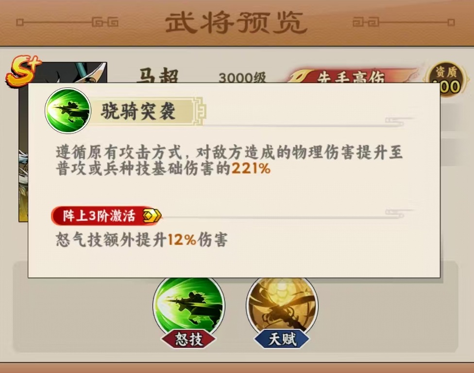 马超隶属骁骑职业,定位为物理近战型先手爆发核心。基础攻击可覆盖敌方一整排单位,具备显著的群体压制能力。其怒气技能延续横向打击特性,并在阵上三阶时激活额外增伤效果,使怒气伤害提升12%。当升至五星品质后,先手值+1,显著优化出手顺序;且每次对先手值低于自身的敌人造成伤害时,有概率触发追击,形成连续输出链。进阶至英杰一星后,对先手值低于自身的目标附加额外伤害,同时降低被高先手目标命中时所受伤害;英杰三星进一步强化生存反馈——怒气技能击杀敌方单位后,自身伤害获得提升;最终达成无双境界时,击杀收益全面升级,伤害加成与减伤效果同步增强。