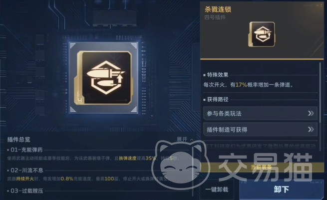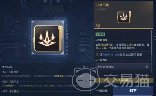 针对高强度交火环境,推荐选用“杀戮连锁”插件。该插件无枪械类型限制,可通过常规途径稳定获取。其效果为:每次扣动扳机时,存在概率额外生成一条独立弹道,有效提升单次射击的命中容错率与区域压制力。另一款侧重持续作战能力的插件是“川流不息”,它不增加弹道数量或弹容量,而是专精于充能效率优化——装配后可提升武器充能速率,特别适配突击步枪与轻机枪类高射速武器。在保持连续射击状态下,最高可叠加至100层,每层提供0.8点充能加成,助力技能高频循环。