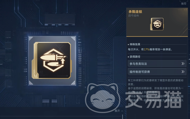 若追求更高单轮输出密度,建议装配“杀戮连锁”(编号#4插件)。该插件使每次射击拥有17%概率额外生成一条独立弹道,形成双线打击效果,有效提升单位时间内的总伤害量。该插件可通过任意PVE/PVP玩法积累材料合成,亦支持插件工坊直接制造,获取路径清晰明确。