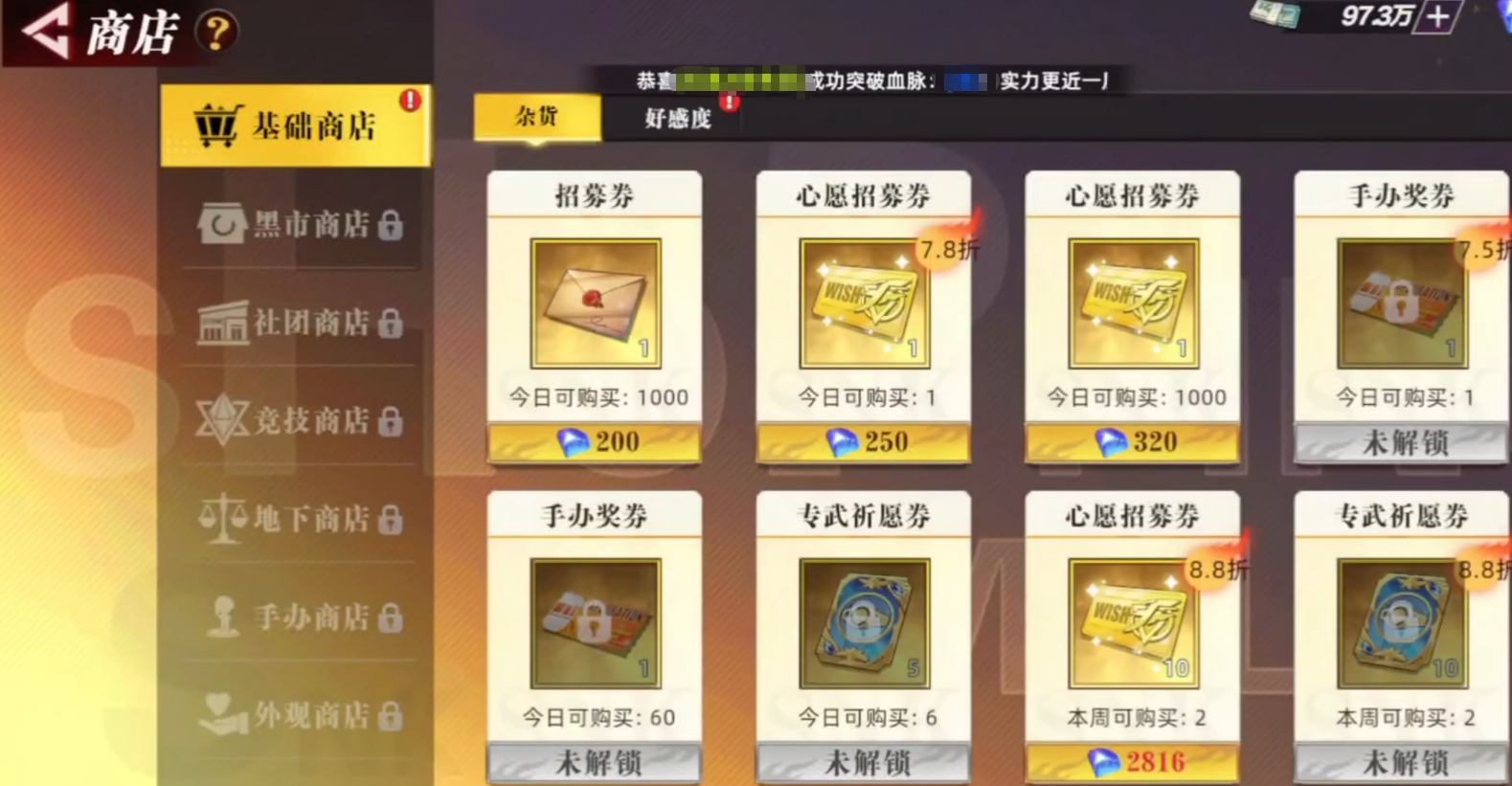 游戏初期仅开放基础商店界面,其中分为“杂货”与“好感度”两大类。杂货区所有物品均以钻石为货币单位,而钻石可通过日常任务、限时活动及充值获得。在众多可购选项中,心愿招募券具备明确的定向抽取功能,且常以折扣形式上架,是前期性价比最高的投入方向——它能显著缩短目标角色的获取周期,帮助玩家更快组建成型阵容。