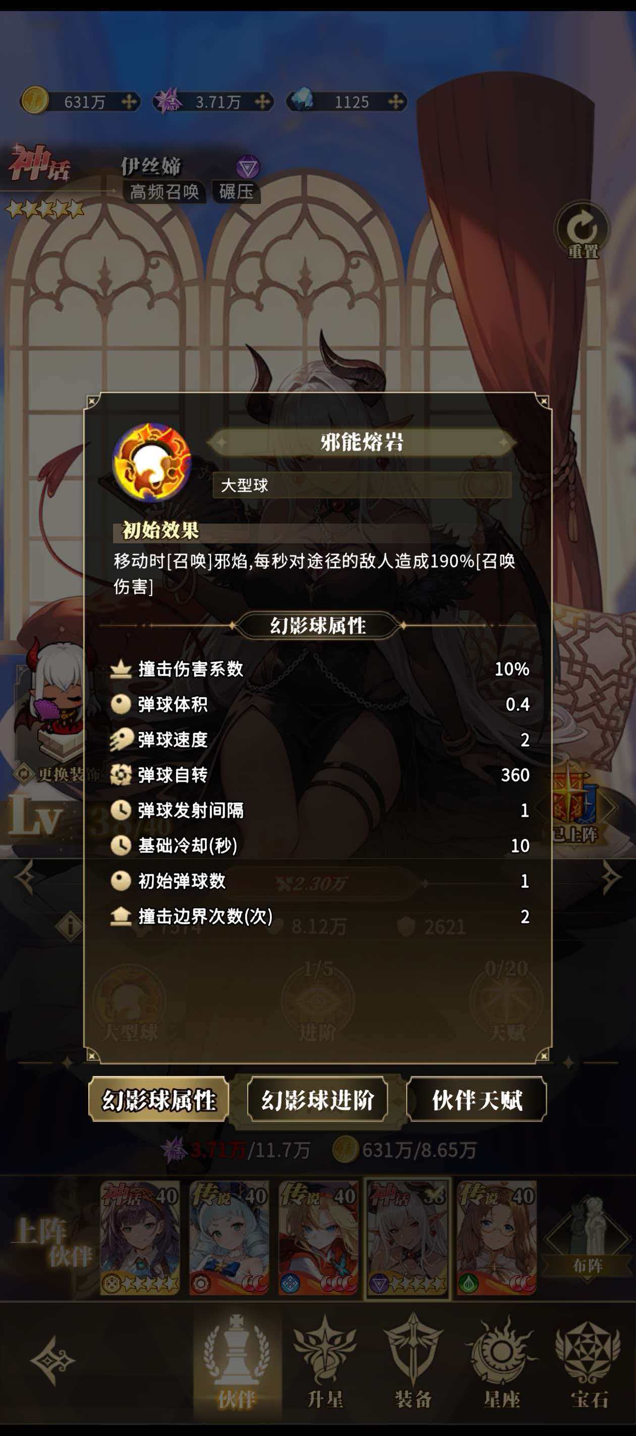 兼具击退控制与链式穿透的物理系角色。幻影球“粉碎战锤”在正面撞击敌人时,有概率触发击退效果,并分裂为多枚碎屑,穿透后续目标。进阶后,整体伤害提升60%,且正面撞击附加40%冲击伤害,使其在应对密集阵型或关键前排时具备极强的打断与连锁压制能力。
