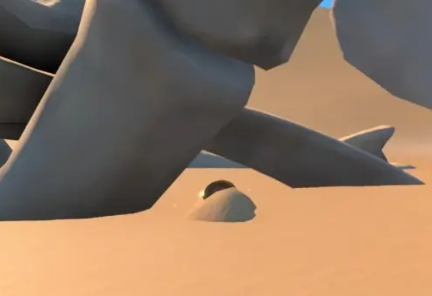 需注意:该点位位于三叉戟蝎常规活动范围内,建议优先清理周边敌对生物后再操作。第三个宝箱位于同一巨型骨架附近,埋于浅层沙堆之中,地面仅存微小弧形凸起(如图所示)。同样需借助羽毛掸子清除浮沙,方能暴露宝箱本体。开启后可获取油条配方,用于后续烹饪系统制作油条。