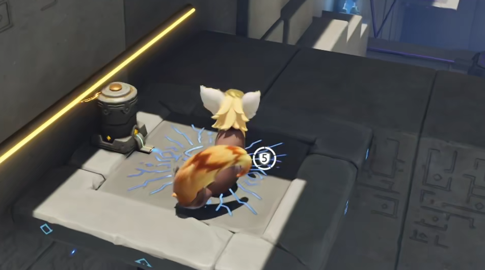 门开启后进入下一区域,此时需派遣队伍中具备电属性的伊莫角色靠近中央激活装置。保持其处于有效作用范围内,装置启动后会自动延伸出可移动平台。待平台平稳抵达面前时,及时跳跃登台。