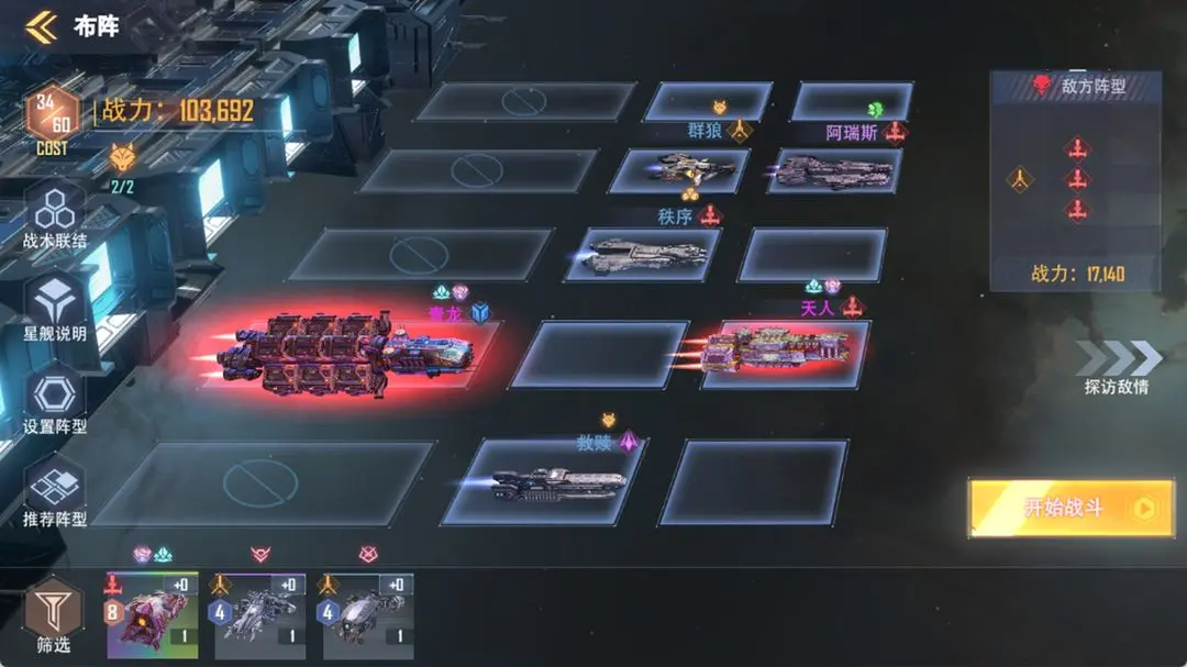 巡洋舰:专注单体精准打击,以高爆发针对关键敌方单位,常规布阵于中排;可有效压制护卫舰,同时受战列舰范围火力牵制。