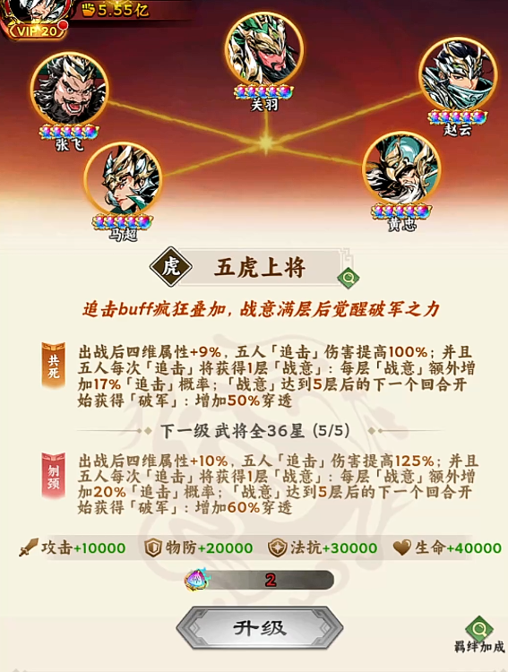 五虎上将阵容由马超、赵云、黄忠、张飞、关羽五名武将组成。集齐后自动激活两项专属羁绊:其一为“追击倍率提升”,其二为“战意增益”。这两大效果并非孤立生效,而是形成攻防一体的循环增强链路,构成该阵容不可替代的战略价值基础。