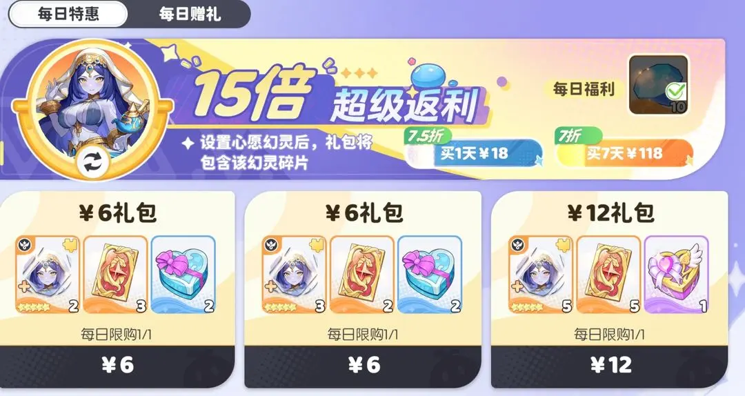 若目标是加速已下线UP池限定角色的升星进度,此礼包属于高优先级投入项。需注意的是,每日赠礼本身不建议单独购买;仅当搭配每日特惠激活后,其每日返还内容才形成有效资源叠加,从而提升整体回报率。