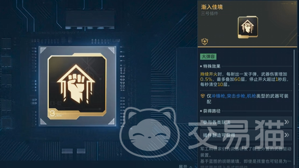针对冲锋枪与突击步枪类中近距离作战武器,“渐入佳境”插件具备高度适配性。其效果为:随射击频率持续叠加伤害增益,每完成一次攻击即获得1层,最高可叠加至60层。该插件属于基础型金色品质,前期即可通过赛季任务奖励直接领取;且随着赛季任务完成度提升,所获插件的基础属性与附加词条质量亦同步增强。