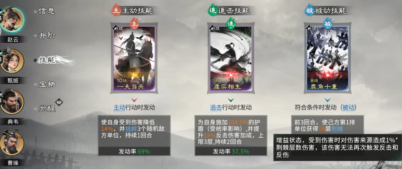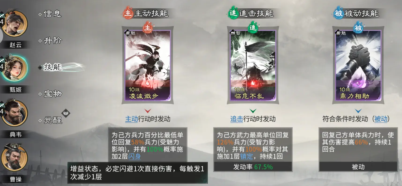 技能配置方面,赵云主推“一夫当关”,使其在承受敌方攻击时,对随机三名敌军施加挑衅,强制其集火自身,大幅提升生存窗口与反击次数。追击技能推荐“虚实相声”,该技能不仅提供护盾,更在触发反击后赋予赵云可观的伤害加成,完美契合反击队的爆发节奏。甄姬主动技能首选“凌波微步”,可在赵云前排承伤时为其附加闪身效果,大幅提升其闪避触发概率,进而增强反击连发稳定性;另一追击技能选用“临危不乱”,该技能按友军当前武力值比例恢复兵力,天然适配赵云这一高武力队友,同时附带镇定状态,有效降低我方角色被控制的概率。