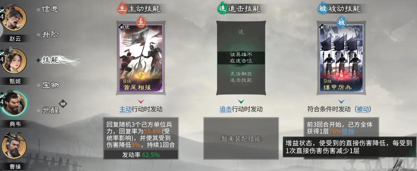 典韦作为前排主力,技能推荐“首尾相援”,可群体恢复我方三名单位兵力,在持续作战中显著压低整体战损。由于其站位固定于前排且不处于追击格子范围内,故无需携带追击类技能。整套体系下,赵云作为反击核心,对单核高爆发武将(如吕布、张辽)压制有限,但在对抗多核均衡型或持续消耗型阵容时表现优异,整体战损控制能力突出。