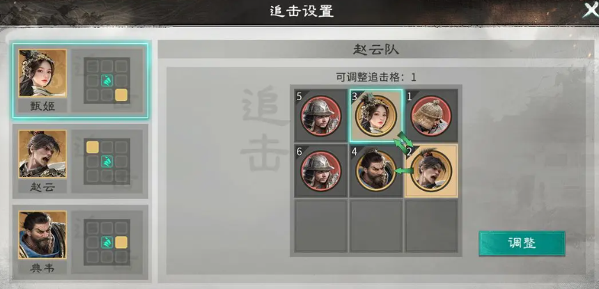 典韦在此阵容中承担双重职责:一方面,其天赋“折冲左右”可在战斗中概率为赵云施加保护效果,降低其受控与暴击风险;另一方面,该天赋亦是反击状态的关键触发源之一,配合赵云的被动反击逻辑,可高频激活全队反击响应机制,构成队伍运转中枢。甄姬则通过天赋提供兵力恢复,并在赵云闪避率提升后,进一步强化其右上格子追击的触发频率;同时,甄姬自身亦可进入赵云追击格子,实现技能联动释放,形成双向追击反馈闭环。