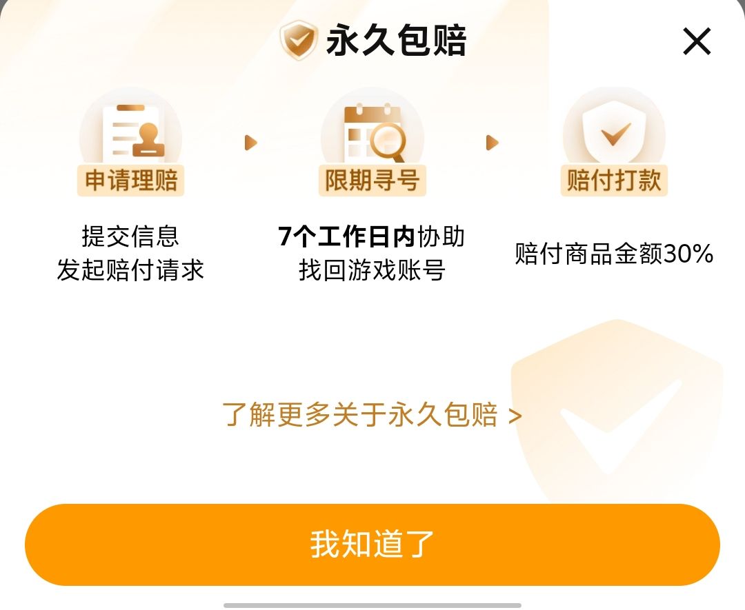 对买家来讲在选择账号的时候可以优先勾选那些带有永久包赔标签的商品,也注意识别一下,是平台赠送的永久包赔服务,还是卖家自行承担的,区别是被找回之后30%或者是100%的赔付,一旦被找回或者是到手之后被回收以及被封禁等等都可以凭借各种证据来申请,由于卖家都是经过人脸识别认证,所以一般不会拿着信誉问题来承担这种风险,对于一些高价值账号的买卖也会有平台客服协助完成换绑,尽可能的降低被找回的概率。遇到非常喜欢并且合适的账号可以考虑自行支付账号的一部分价格来购买包赔服务,这样账号到手之后更安心。