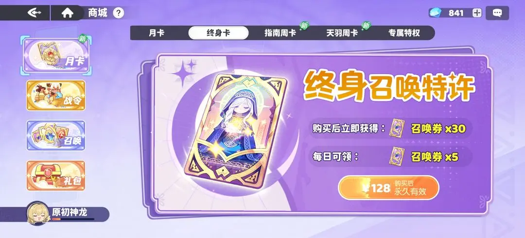 终身卡适用于追求长期稳定资源供给的玩家。该档位每日赠送5次常驻卡池抽取机会,显著缓解角色培养所需的“狗粮”压力;所获角色多具备塔类副本适配优势,在爬塔玩法中表现稳健。