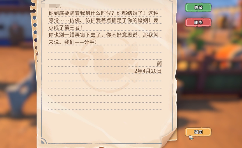 在《沙石镇时光》中,玩家不仅能沉浸于自由度极高的农场经营与生活模拟,还能与多位性格鲜明的异性NPC建立深度情感联结。当好感度达到指定阈值后,即可正式确立恋人关系。但这段关系并非一劳永逸——若维护失当,系统将触发分手机制,玩家将收到由对应角色寄来的分手信。本文将全面解析分手信的触发逻辑、预防方式及情感系统的核心规则。