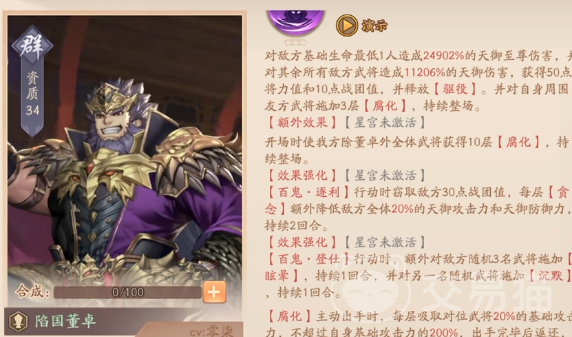 综合来看,董卓并非传统意义的纯防御角色。其技能设计赋予其稳定的续航能力与可观的百分比伤害转化效率,即使未搭配吕布,单人出场亦能凭借高覆盖率的恢复机制应对多段群体攻击。在资源分配上,推荐优先提升其生命值与物理防御属性,以最大化百分比技能收益。作为兼具战术灵活性与养成性价比的优质角色,董卓值得投入长期培养。