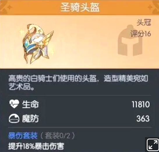 这款防御向头盔兼具美学与实用性,外观呈现高工艺雕琢质感。属性方面提供11810点生命值与363点魔法防御,同时提升18%暴击伤害。其定位明确服务于“爆伤流”体系,特别适配拥有高暴击率基础或能稳定触发暴击增益机制的角色,有效放大关键一击的终结能力。