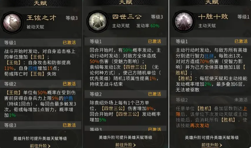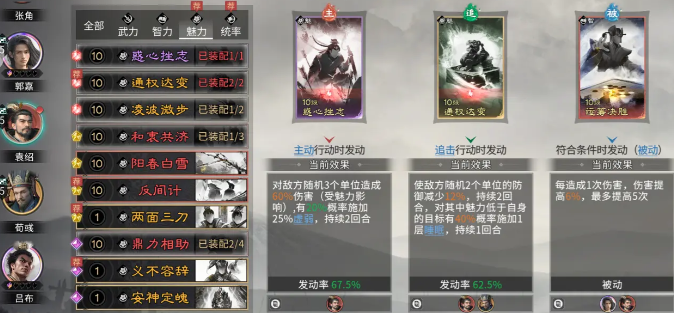 袁绍自带天赋“四世三公”具备初始群伤能力,配合荀彧“王佐之才”的属性增幅后,可进一步激活郭嘉“十胜十败”的概率增益链路,使全队技能发动效率显著提升。技能配置方面,袁绍推荐携带【惑心挫志】【通权达变】【运筹决胜】三技能:前两者强化群体压制与状态施加(如虚弱),后者则为核心被动增幅技,可多次触发其天赋效果,并附带首次受击后兵力增长机制;追击过程中还存在概率触发睡眠控制,形成兼具输出、减员与控场的复合打击链。