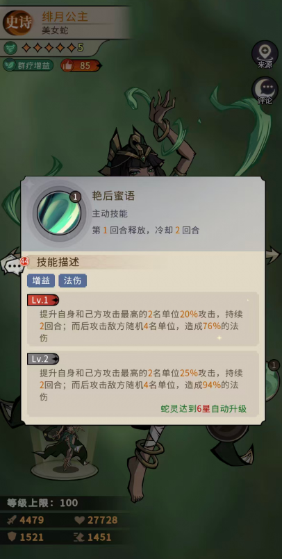 被动天赋“美女蛇体质”提供基础生存保障:初始获得10%最大生命值与5%攻击力加成;升至十星后,提升至20%生命与10%攻击。其中生命加成对提升容错率尤为关键,有效缓解其作为后排辅助易被集火的风险。实战操作中,技能释放顺序至关重要——必须优先启用“艳后蜜语”,以此激活增益状态,从而提升后续治疗与输出的综合效能。若顺序颠倒,将导致治疗量与群伤均无法达到预期强度。